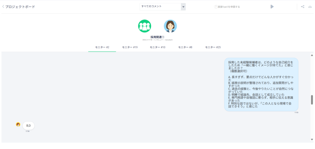 - 設問内容: 自己紹介について「採用の決め手になったポイント」「不採用にしたポイント」をヒアリング