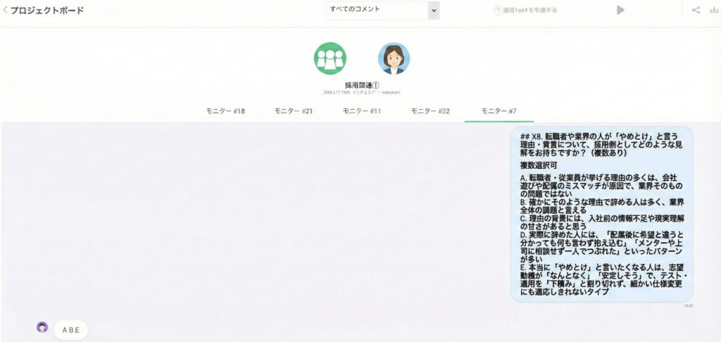面接官と転職者に同じテーマを聞くことで、採用側と本人で見方がどう違うかを票数で可視化しています。