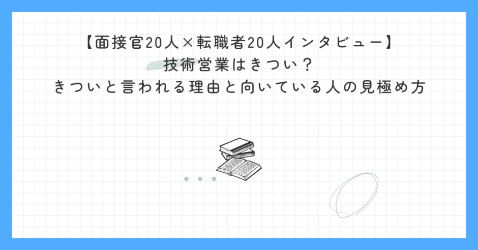 この記事では、僕が個人で有料ツールを使用して、採用担当者20名・転職者20名(いずれも技術営業経験者)へのインタビュー調査をもとに、きついと言われる理由、向いている人・向いていない人の特徴、きつい環境の実態、会社選びのポイントをお伝えします。